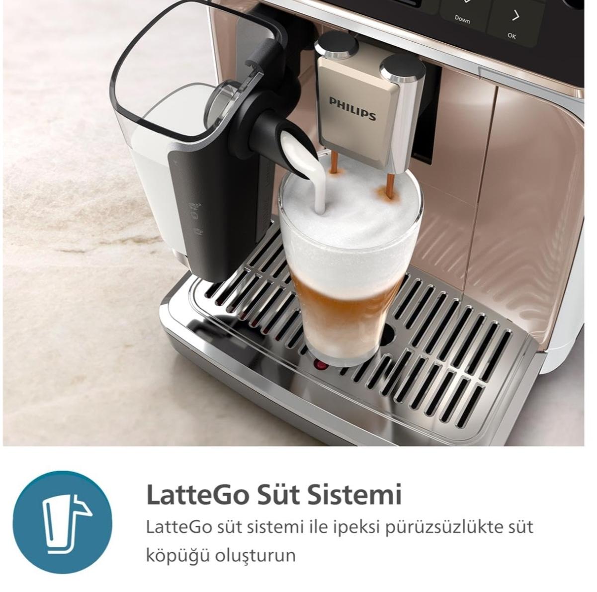 - LatteGo süt sistemi: Güçlü siklonik köpürtme teknolojimiz, bitki bazlı süt alternatifleriyle bile tek bir düğmeye dokunarak ipeksi pürüzsüzlükte süt köpüğü elde etmenizi sağlar